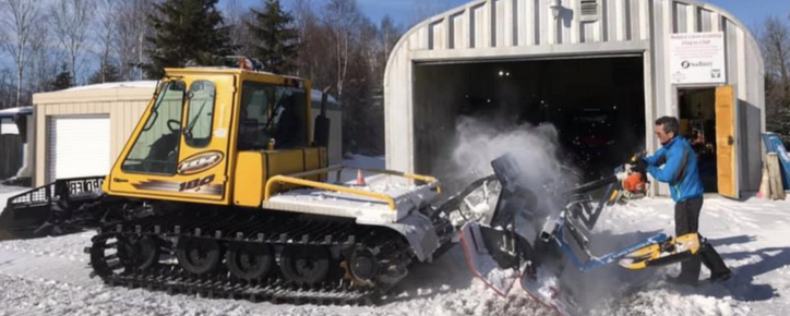 When there is enough base later into the season, we can use the Bombardier BR-180 groomer so the base doesn’t get damaged by the tracks and dig up dirt from the ground underneath the snow. The Bombardier is a diesel driven tracked machine with a plow on the front to level out drifts on the trail and also used to plow the parking lot. On the back is the groomer that has a rotating tiller that can be raised or lowered as needed to soften the snow and a comb behind it smooths the snow leaving a corduroy pattern. There are two left and right tracker paddles after the comb that can be used singly or together to apply a track.